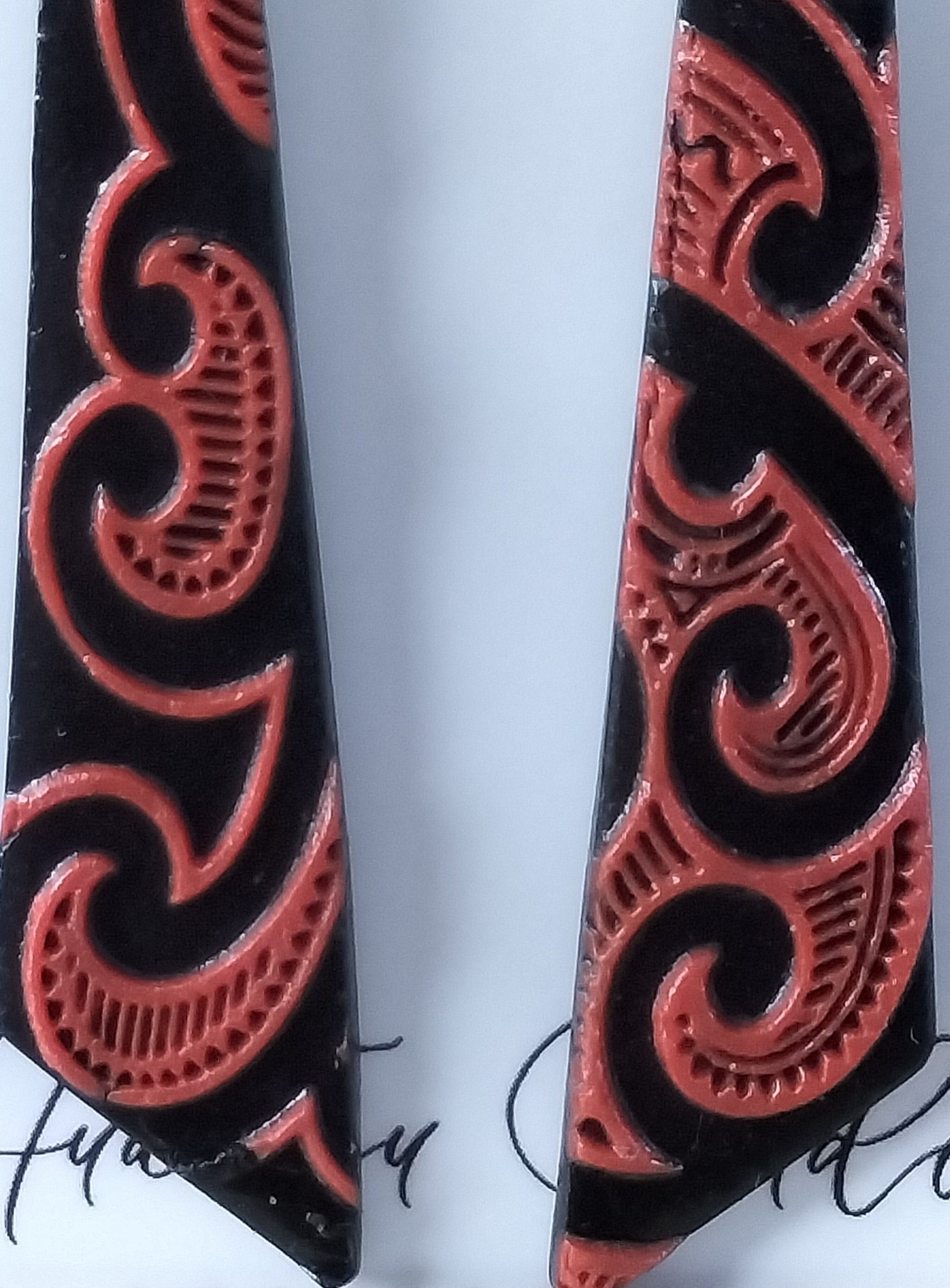 These striking earrings draw inspiration from culturally significant shades, featuring a sophisticated interplay of deep black with vibrant red accents. The Toru design celebrates Māori artistic traditions through a carefully balanced colour palette that commands attention while maintaining refined elegance. Each piece showcases the seamless blending of these complementary tones, creating a distinctive accessory that honours cultural heritage with contemporary style.